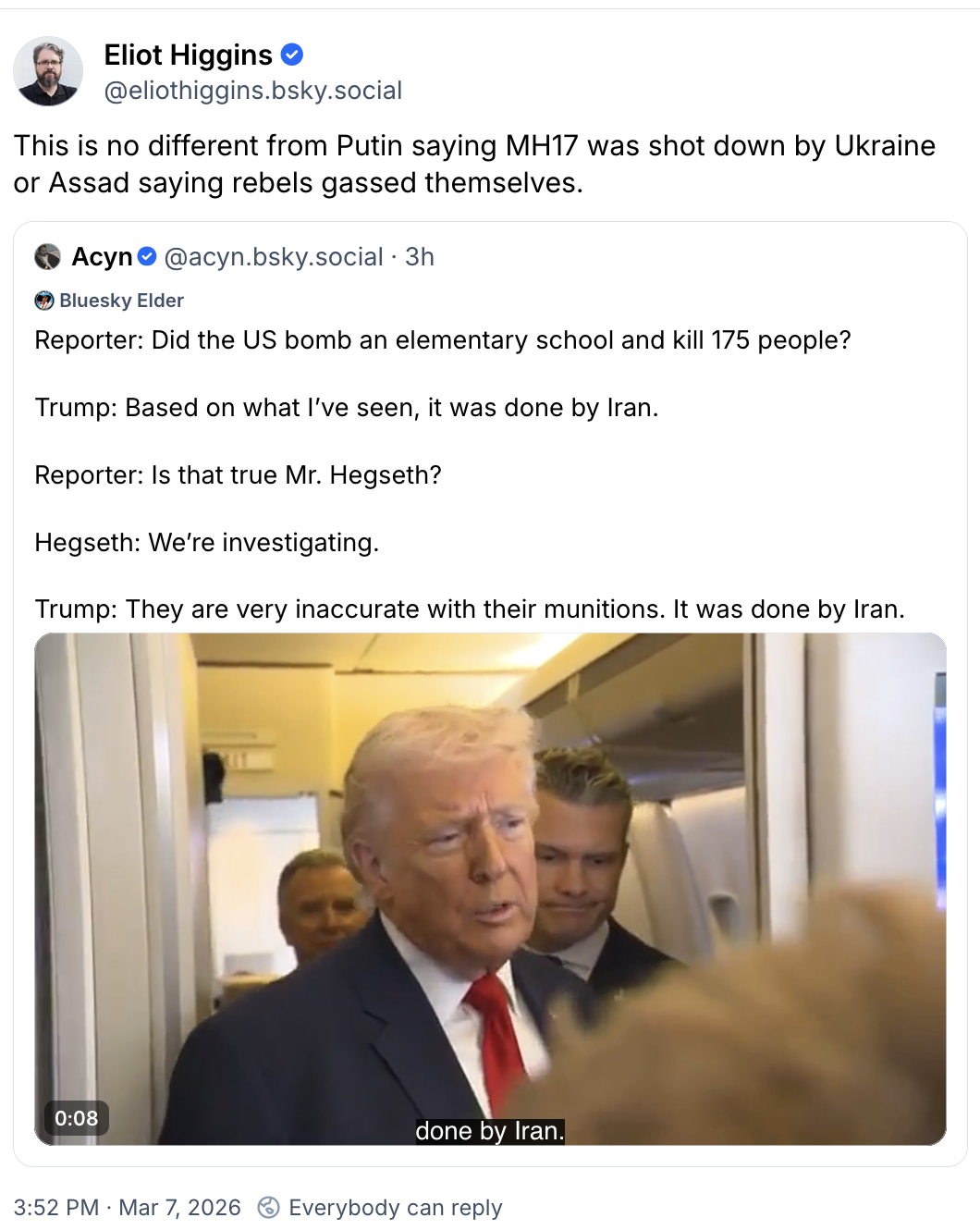 Following Hegseth’s statement, Trump asserted: “It was done by Iran.”