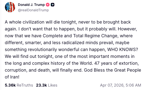 It doesn’t stop there. Trump this morning explicitly threatened war crimes in another post that I had to check to ensure it was real. It is. Clicking on the image will take you to the post.